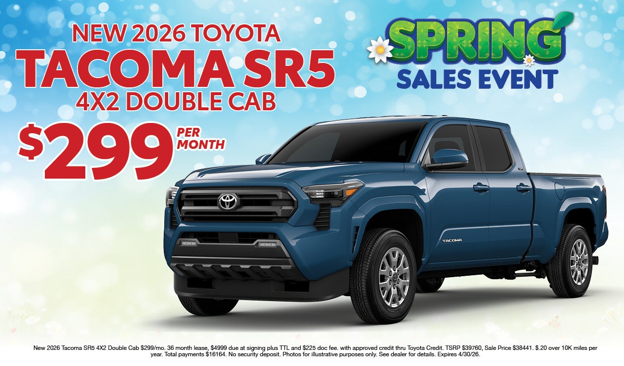 New 2026 Tacoma SR5 4X2 Double Cab $299/mo 36 month lease, $4999 due at signing plus TTL and $225 doc fee. with approved credit thru Toyota Credit. MSRP $39760, Sale Price $38441. $.20 over 10K miles per year. Total payments $16164. No security deposit. Photos for illustrative purposes only. See dealer for details. Expires 4/30/26.